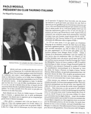 Ringraziamo l'amico Miguel Darrieu e tutta la redazione di TOROS per questa intervista al Presidente del Club Taurino Italiano che permette di far conoscere il nostro Club anche ai lettori della prestigiosa rivista francese pubblicata sul numero 2065 del 9 febbraio 2018.