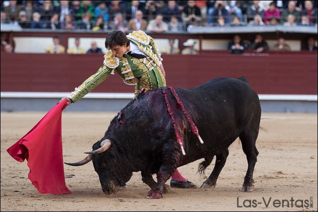 El jabonero sucio de Núñez del Cuvillo que hacía quinto traía unas hechuras montadas y bastas. Al abandonar el peto arrolló a Trujillo, que se cruzó. Mal estilo derrochó en el capote del buen peón. Alejandro Talavante se dobló y perdió la muleta en el primer cabezazo de muchos. Guasa. Talavante apostó por la mano izquierda, que era el pitón menos malo. Y aun así... Valor desnudo para torear al natural como si fuera bueno. Otro desarme, otro hachazo que partió el palillo. Embestía a taponazos. Tala se la jugó. Imposible la aventura por la derecha. Y de pronto la muleta empredió el camino por abajo para evitar los derrotes y los naturales morían limpios y hermosos, transmitiendo una enorme verdad. La última tanda la abrochó con una trincherilla de pura muñeca y un pase del desprecio que elevaron los decibelios de los oles. La alzada y el bruto comportamiento de la bestia ponían como un redoble de tambor al volapié. Salvó Alejandro el trance metiendo el brazo, tocando con el puño la piel. La estocada desembocó en una muerte fulminante. La oreja cayó con fuerza. Como el toro. Cuando la paseó por delante de Don Juan Carlos, alguien apuntó que había sido precisamente el torero español el único que no había brindado al viejo Rey de España...
