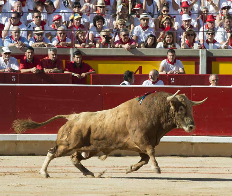 Única actuación en Pamplona del Juli, con sus toros preferidos. El segundo va y viene, algo distraído. El diestro lo administra con facilidad y oficio, le baja la mano con la izquierda. Ha estado más seguro que brillante, con un toro medio. Mata alargando el brazo: oreja. El quinto flaquea ya de salida; además, se astilla los dos pitones, como brochas. Con esas dos carencias, el trasteo tiene escasa emoción, aunque Julián está sobrado, inteligente y técnico. Pincha antes de una estocada con salto: otra oreja y la salida a hombros, que el público estaba deseando.