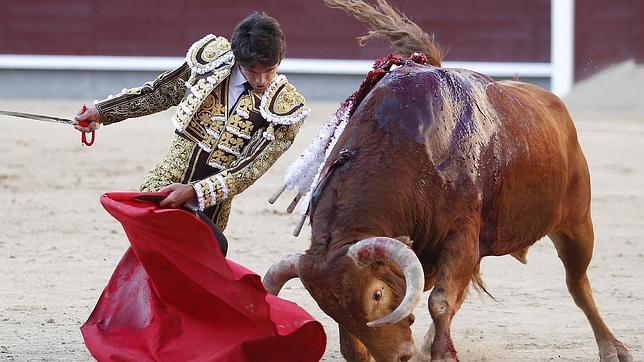 Seis, siete muletazos en la misma gavilla. Cambios de mano, salidas descargadas de hombros, teatro cero, verdad rotunda. Un jaleo indescriptible, porque el ritmo de la faena fue como el fuego de Roma. A espada cambiada, Castella decidió, antes de cuadrar, adornarse con muletazos genuflexos cambiados o en la suerte natural, de limpio y bello trazo. Una estocada soltando el engaño, sonó un aviso antes de doblar el toro. Dos orejas y vuelta para el toro, que fue de apuntar la reata.