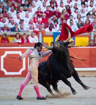 Majeza mayor de Juan, templado por las dos manos. Autoridad impropia de torero nuevo pero no tanto. Lo que no pudo ser fue pasar con la espada. Cuando más caliente estaba la gente. ¡Con lo que cuesta meter en faena a las peñas de Pamplona en el sexto de corrida! El viento molestó al torero salmantino mientras faenó lindamente con el tercero. Ayudándose de la espada al torear con la zurda. Ligando sin perder nunca pasos. Mucha firmeza, cierta alegría cuando sintió tener el toro gobernado. Pero una estocada tendida y soltando el engaño tras un pinchazo mínimo.